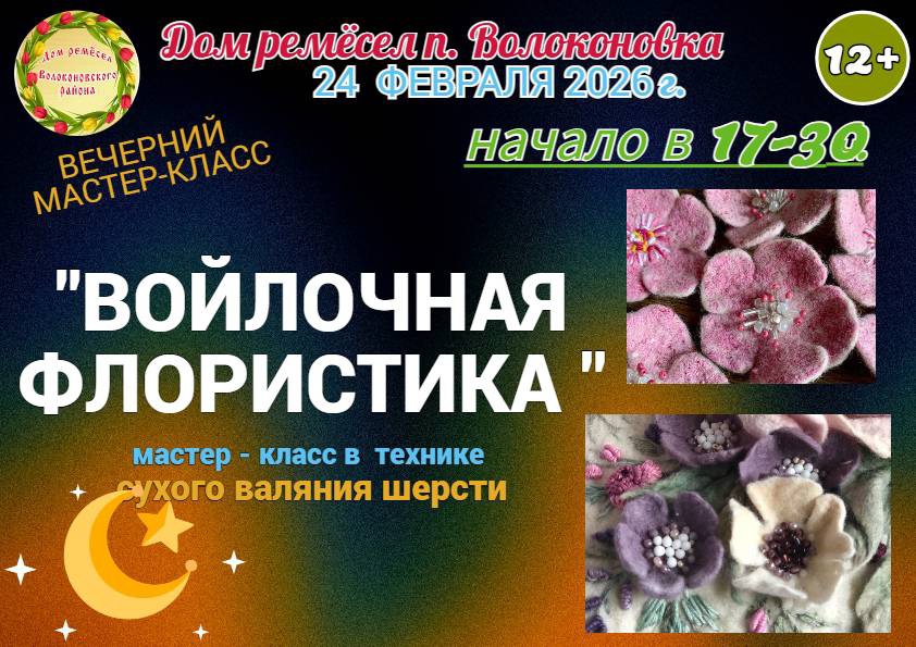 "Шерстяная мастерская" приглашает провести вечер за интересным занятием в творческой, теплой компании . Вы своими руками сможете изготовить войлочные цветы, которые могут стать милой брошкой или элементом декоративного панно. Ждем ВАС 24.02.26 в 17-30 в мастерской Дома ремесел по адресу: ул. Ленина, 20 А , здание ЦКР ( Дом ремесел).